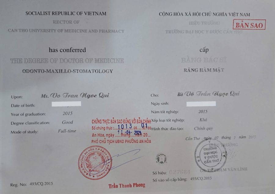 – Chứng chỉ chuyên Khoa Cấp I Chuyên Ngành Răng Hàm Mặt – Trường Đại học Y Dược TP.HCM (2022)