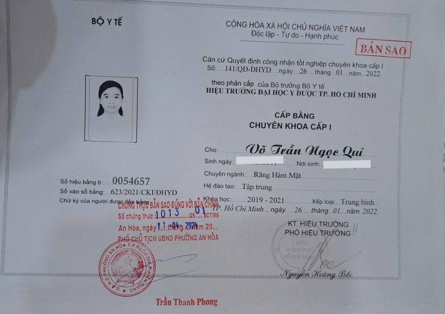 Chứng chỉ: Chuyên Khoa Cấp I Chuyên Ngành Răng Hàm Mặt – Trường Đại học Y Dược TP.HCM (2022)
