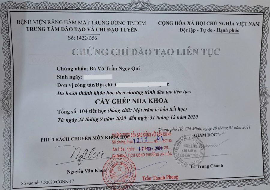 – Chứng chỉ đào tạo liên tục: Cấy ghép nha khoa – Bệnh viện Răng Hàm Mặt Trung ương TP.HCM (2020)