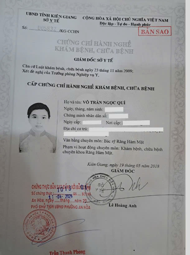 Chứng chỉ hành nghề khám bệnh, chữa bệnh của bác sĩ Võ Trần Ngọc Quí được cấp bởi Sở Y tế Kiên Giang, chứng nhận bác sĩ đủ điều kiện hành nghề trong lĩnh vực nha khoa. Đây là chứng chỉ pháp lý quan trọng, cho phép bác sĩ thực hiện các dịch vụ khám và điều trị răng miệng cho bệnh nhân một cách hợp pháp và an toàn.
