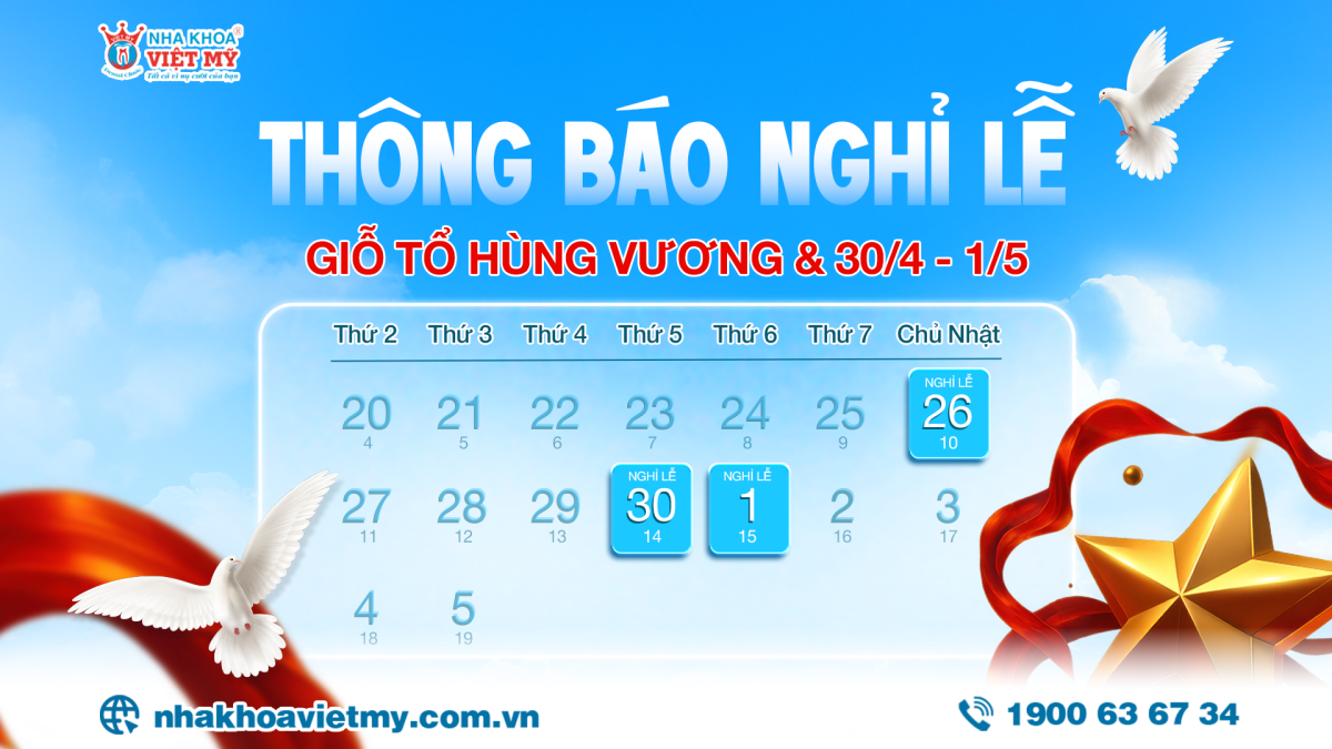 Để Quý khách thuận tiện sắp xếp thời gian thăm khám, Nha khoa Việt Mỹ xin thông báo lịch phục vụ khách hàng nhân dịp đại lễ Giỗ tổ Hùng Vương, ngày Giải phóng miền Nam, thống nhất đất nước (30/4) và Quốc tế lao động (1/5).
